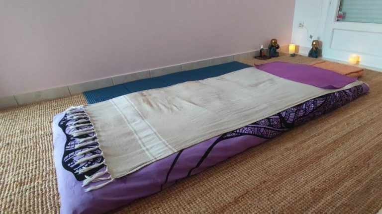 La seconde partie se déroule allongé sur un futon (matelas japonais) posé au sol. À l’aide des pouces et des paumes, j’exerce des pressions sur différentes zones du corps afin de relancer la circulation énergétique.
